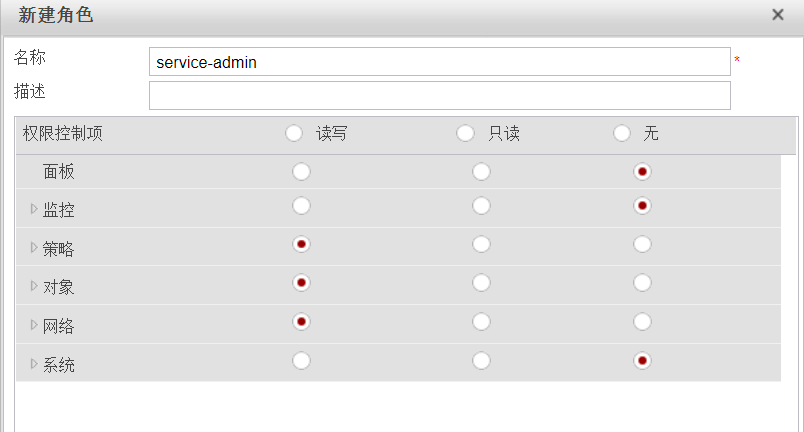 - 分配service-admin角色,授予 "策略、对象、网络" 相关的读写权限,限制 "面板、监控、系统" 相关权限。