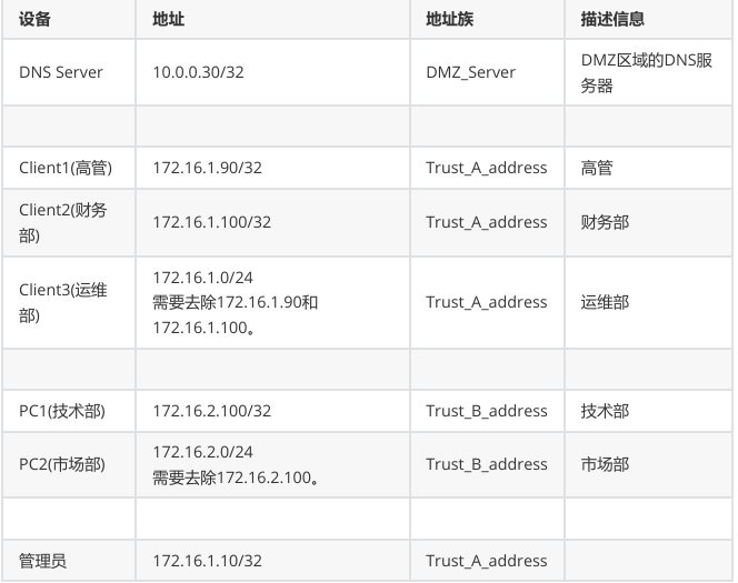 - 创建 Trust_A_address 地址组,包含 Client1(172.16.1.90/32,高管)、Client2(172.16.1.100/32,财务部)、Client3(172.16.1.0/24,运维部,排除 172.16.1.90 和 172.16.1.100)及管理员 PC(172.16.1.10/32),描述为 "部门 A(高管 + 财务 + 运维 + 管理员)地址集合"。