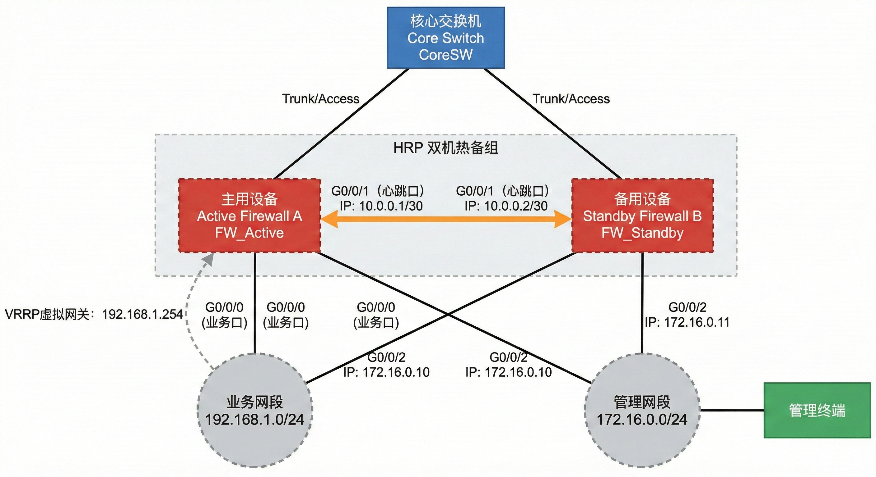 - 主设备:G0/0/0(业务口,连接核心交换机)、G0/0/1(心跳口,连接备用设备G0/0/1)、G0/0/2(管理口)