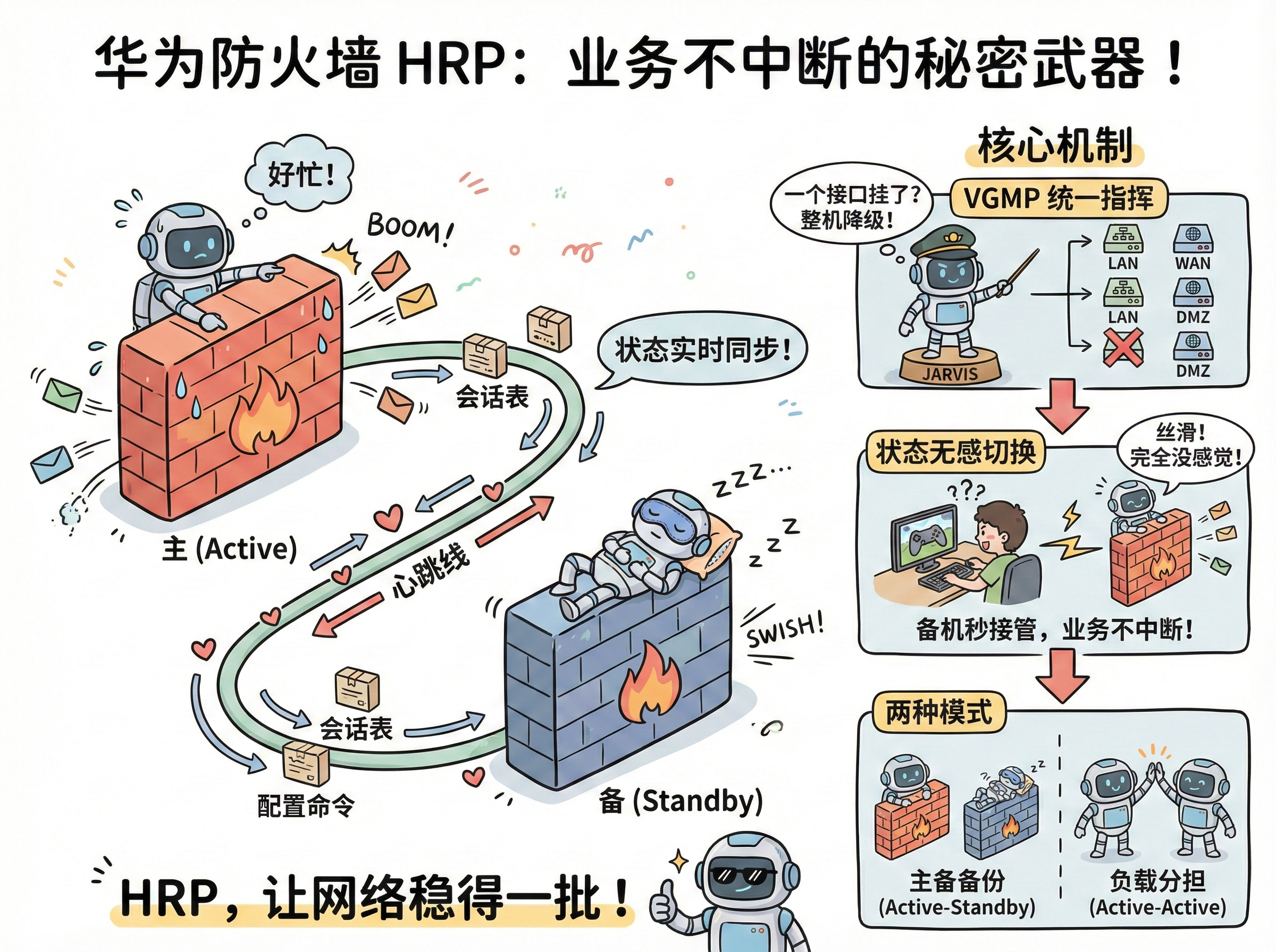 和VRRP不同,HRP不仅能实现网关冗余,还能同步防火墙的会话表、NAT表、攻击防御策略这些业务配置。VRRP只是网关层面的切换,切换后新的主设备需要重新建立会话,会导致业务中断几秒钟;而HRP是会话级别的同步,切换后业务几乎无感知。