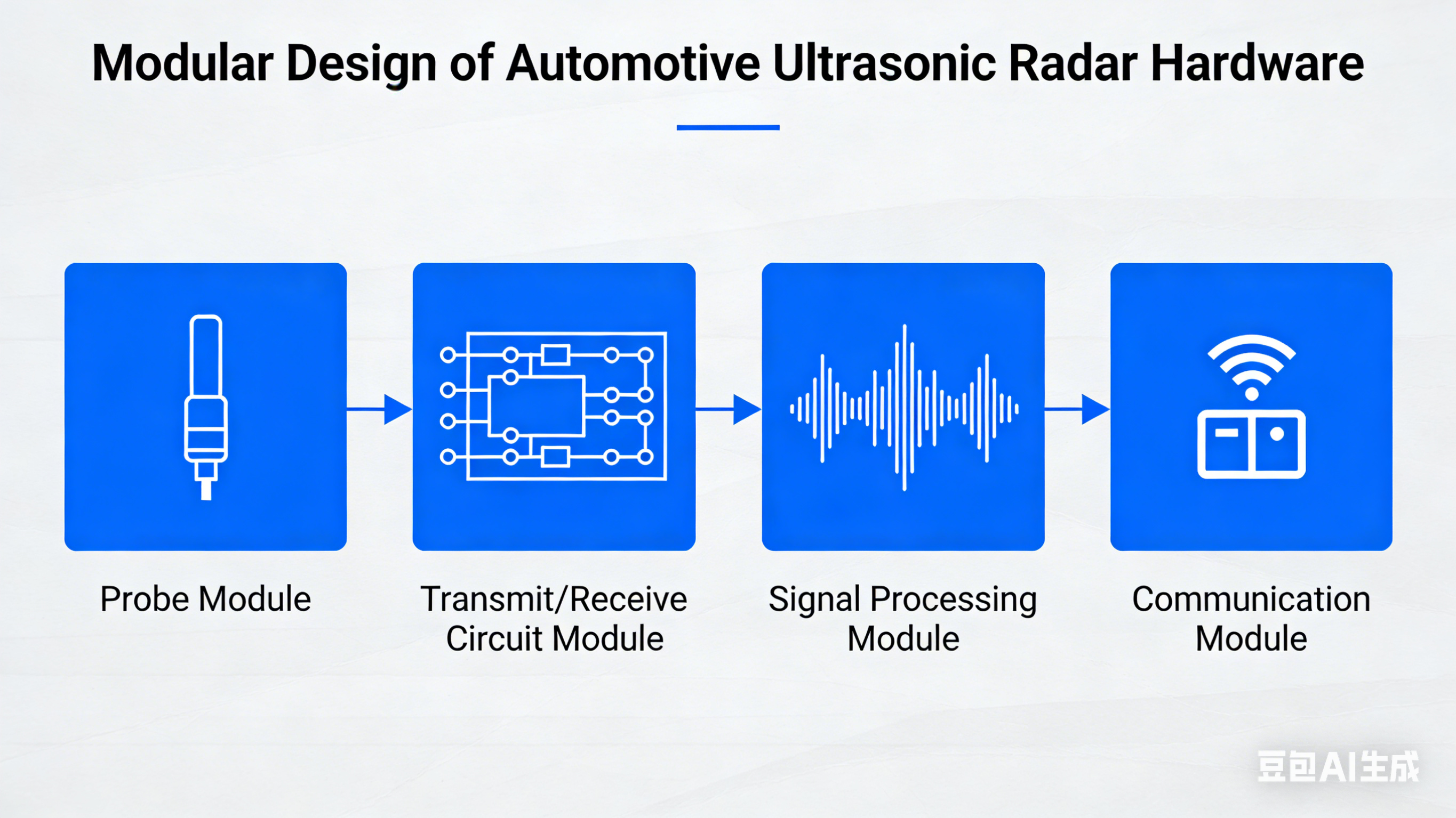 车载超声波雷达硬件采用模块化设计,核心由探头模块、发射/接收电路模块、信号处理模块、通信模块四部分组成,各模块协同实现超声波的发射、回波接收、信号解析与数据传输,具体实现细节如下: