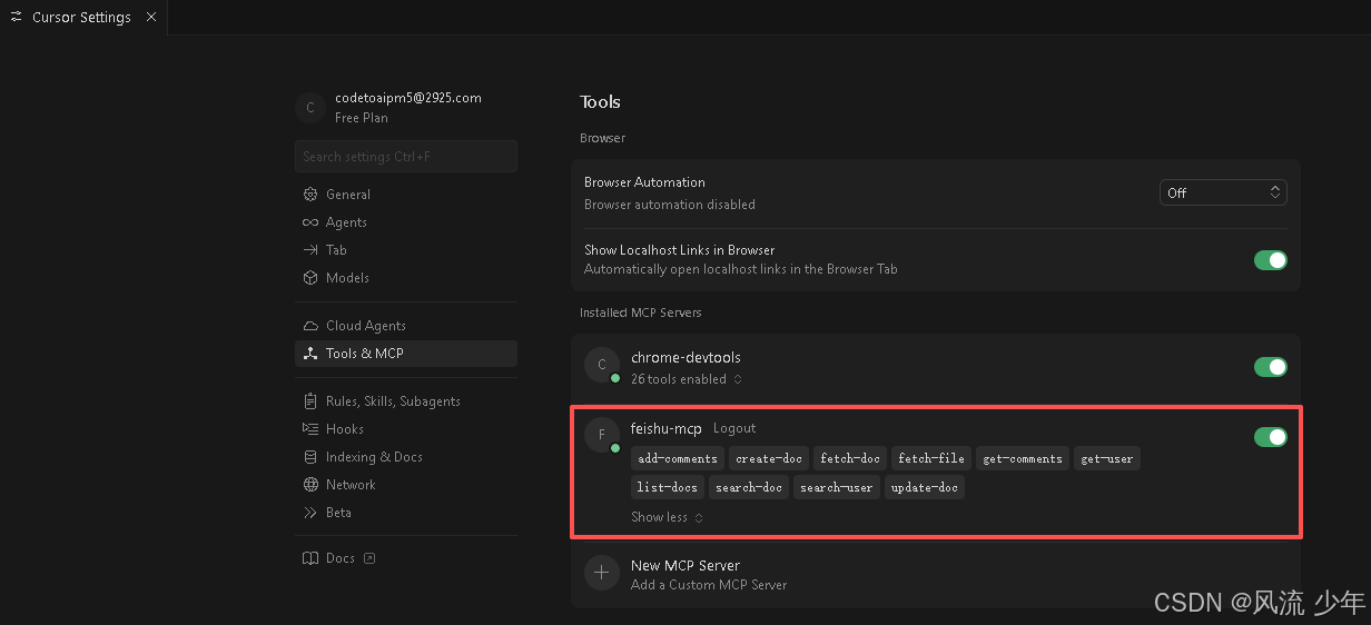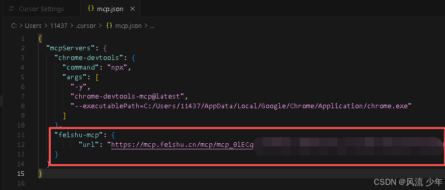Cursor Settings ---> Tools & MCP --> New MCP Server ---> 将feishu-mcp配置到mcp.json中。