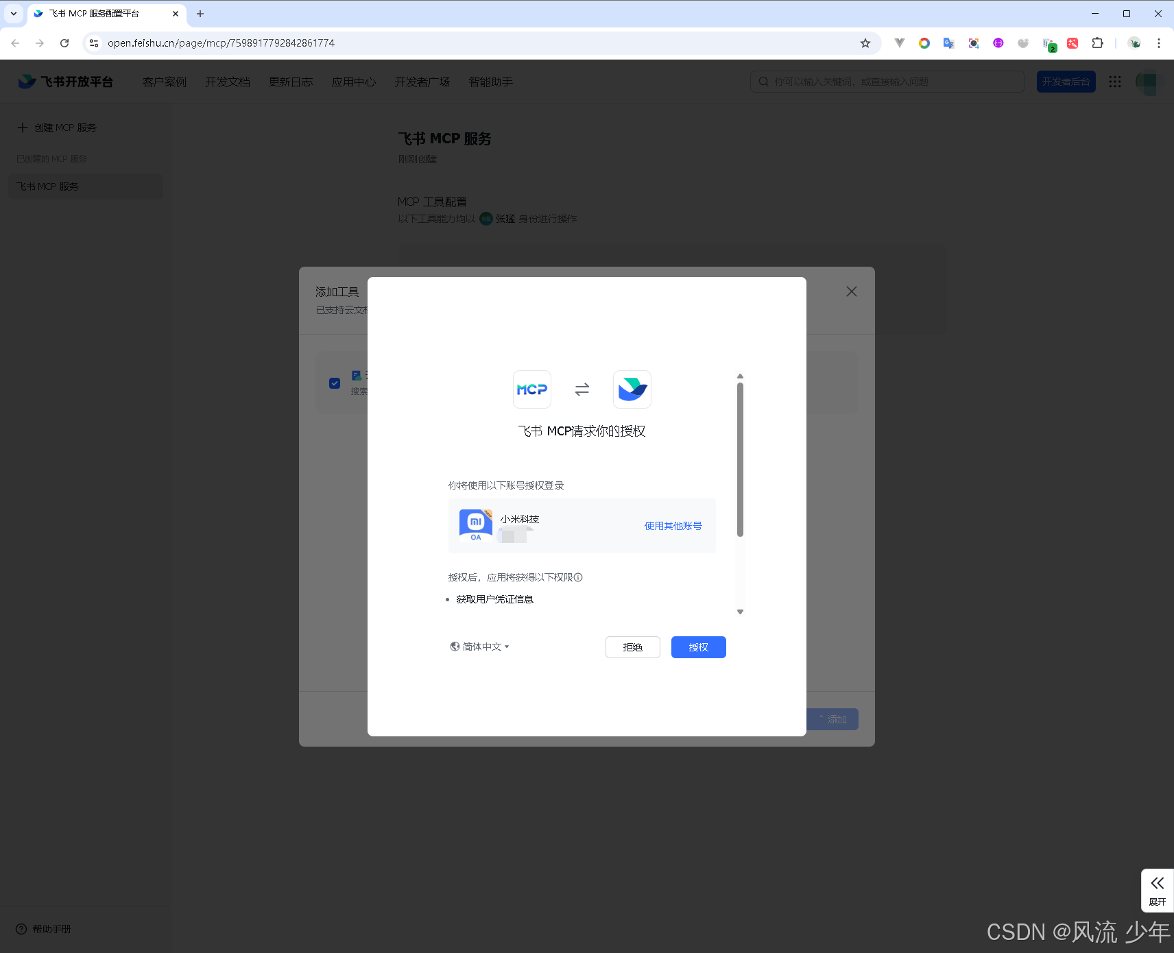 - 点击 确认添加,并在弹出的 获取用户授权 对话框,确认授权用户登录信息、飞书 MCP 应用获得的权限信息后,点击 授权。