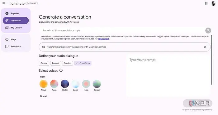 Illuminate 去掉了那些额外的功能,专注于一件事:通过 AI 生成的播客对话让学术研究变得易于理解。你不能上传自己的文件(这个功能还在待定中),但你可以给它提供来自 arXiv.org(一个包含物理学、计算机科学、生物学和经济学科学论文的巨大存储库)的 URL,几秒钟内,两个 AI 声音就会以自然的、一来一回的对话形式解析这项研究。
