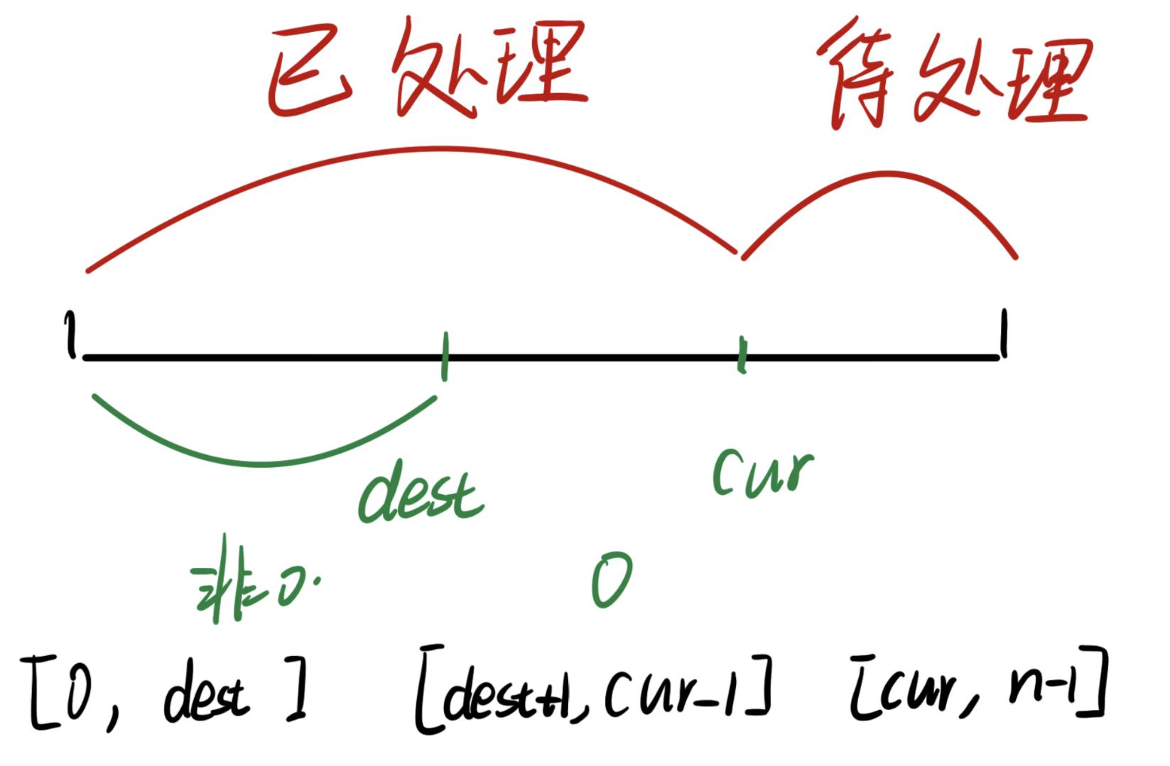 dest和cur,数组被分为三个区域cur从左往右扫描数组dest表示已处理区间内非0元素最后一个位置