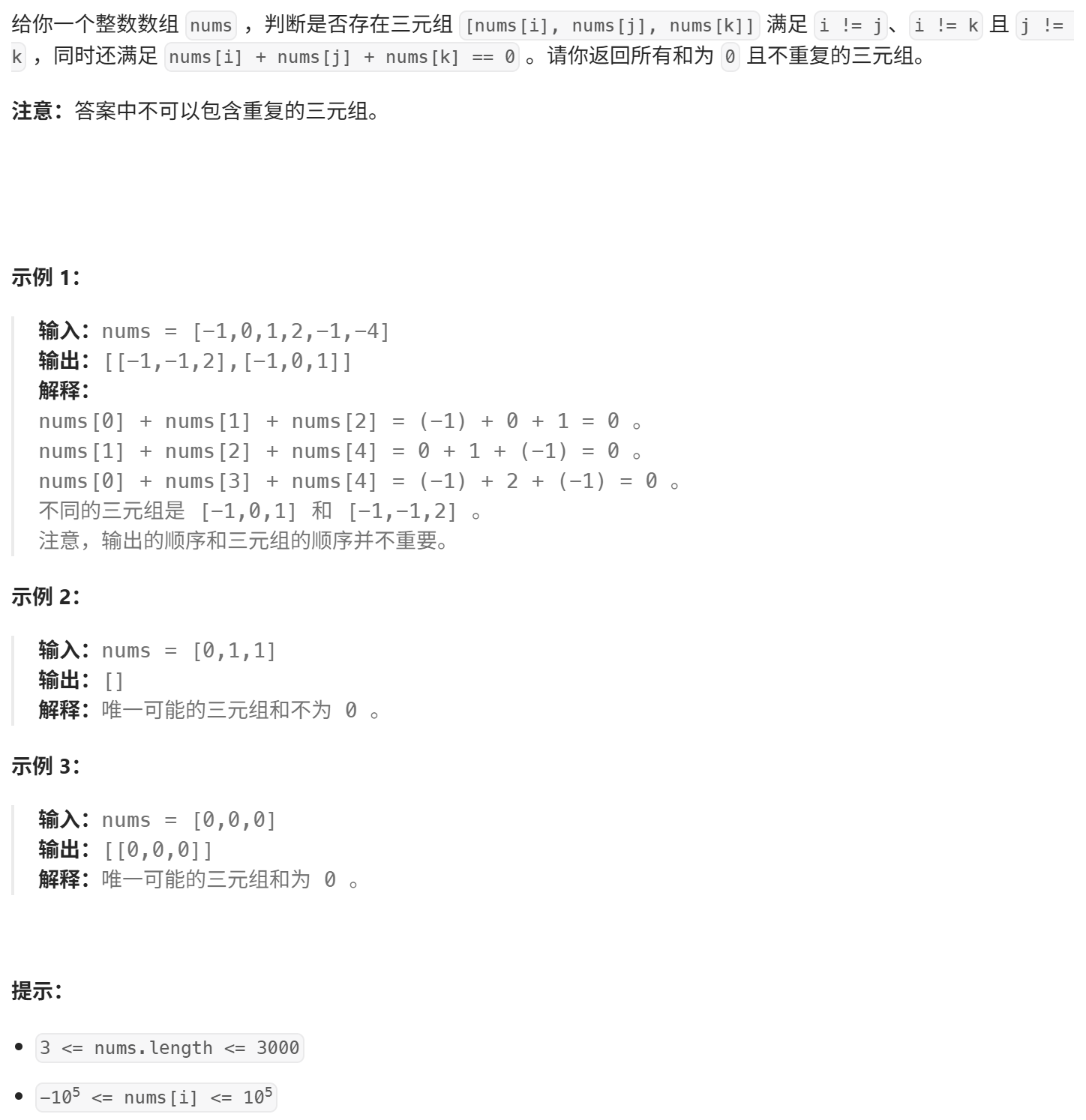思路二:排序+双指针法 先固定一个数,在剩下的区域内找和为固定值的相反数的组合,与上一题类似。