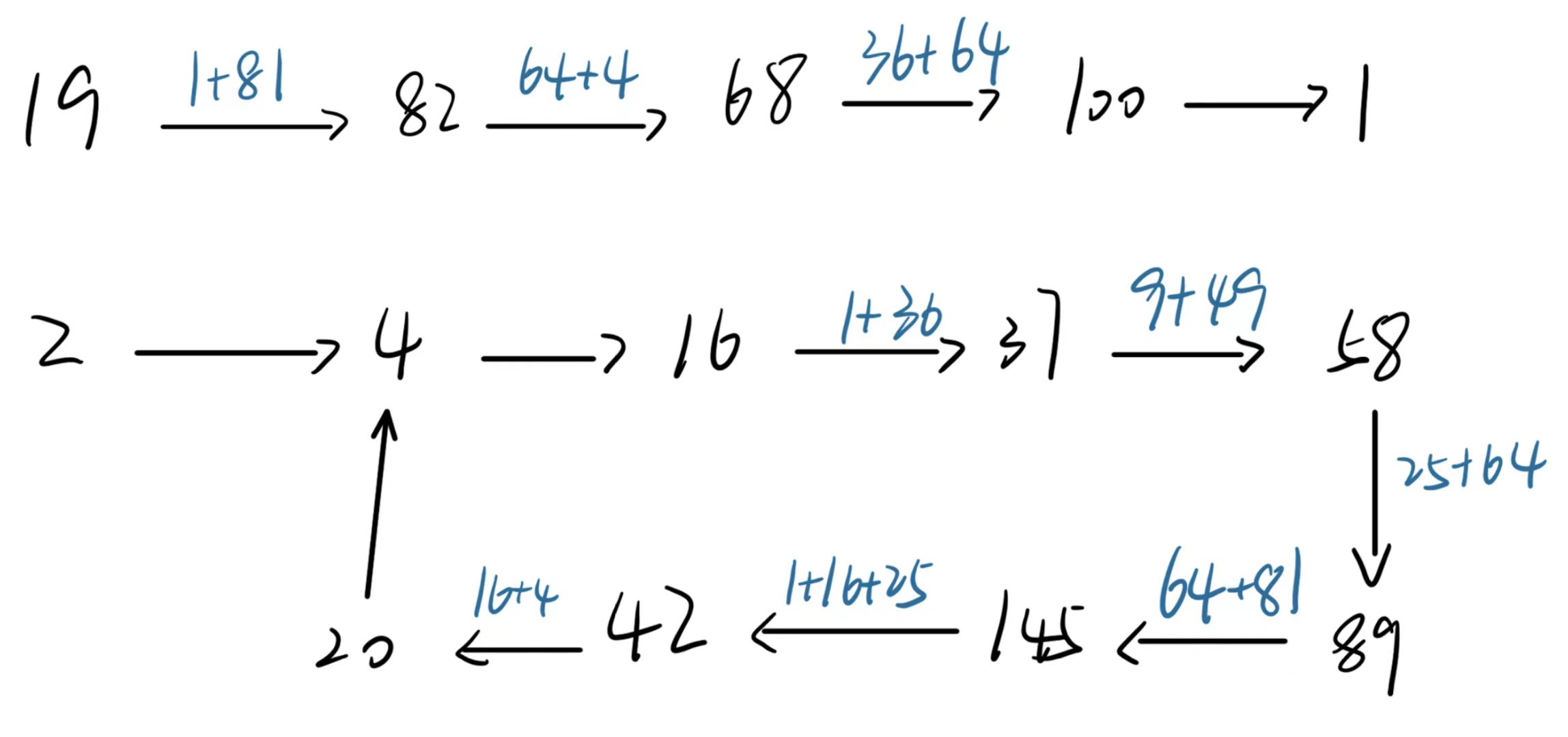 分为两种情况:一种是结果为1,另一种是结果成环。第一种情况也可以抽象理解为环里的数字都为1。类似于判断链表是否存在环,采用快慢指针方法。(这里指针只是一种思想,落到这个题里面是指两个整型变量.)