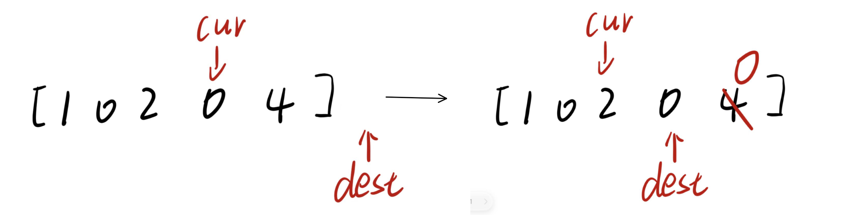 [非0区域,0区域,待处理元素],所以遇到0不需要做任何操作,只需要让cur++; - 遇到非0:dest表示非零元素的最后一个,所以先让dest++,