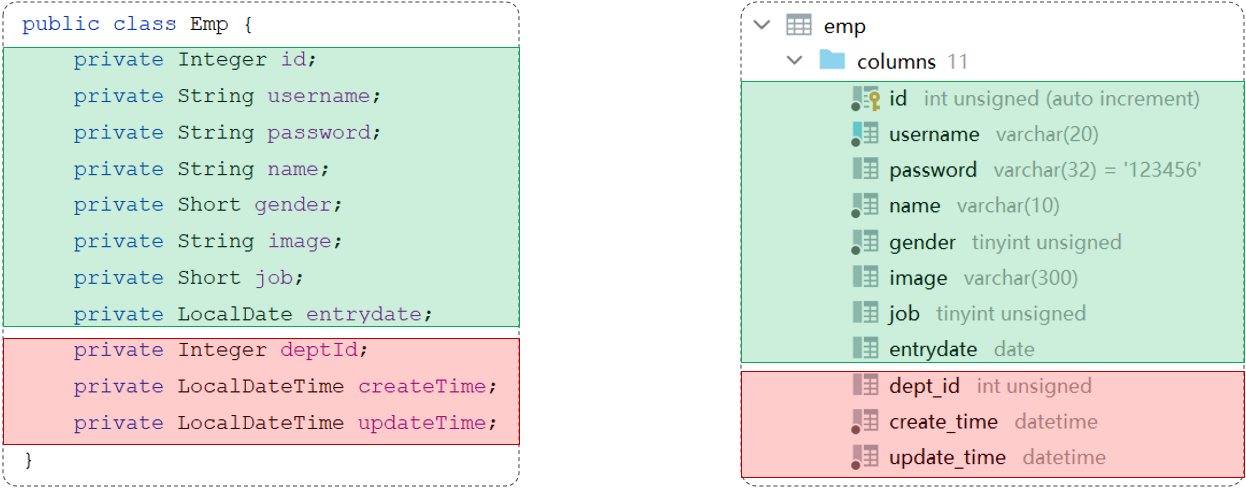 我们看到查询返回的结果中大部分字段是有值的,但是deptId,createTime,updateTime这几个字段是没有值的,而数据库中是有对应的字段值的,原因如下: