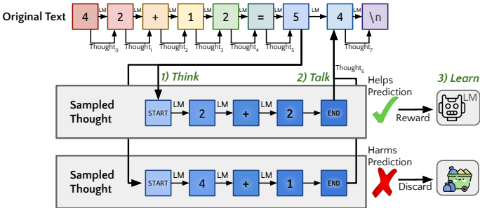 Learn (学习 - 强化反馈): 怎么判断思考好不好?如果引入了思考后,模型预测未来文本 (不仅仅是下一个字,而是后面的一串字)的概率变大了,说明思考有效,给予奖励(Reward);反之则惩罚 输出 (Output): 一个学会了在输出之前先生成内部思维链(Chain-of-Thought)的模型,它在预测困难文本时更加准确。