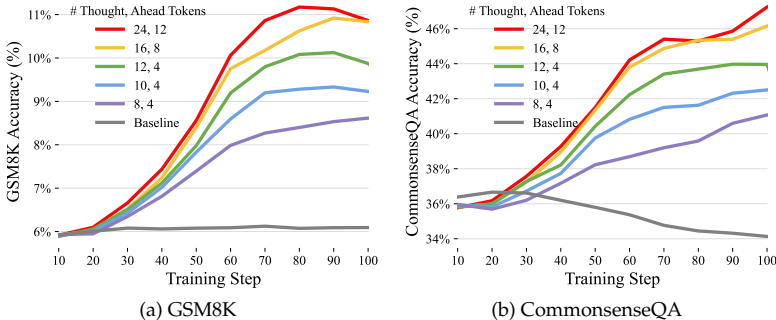 下游任务性能显著提升 :经过Quiet-STaR训练后,模型在未经过任何任务微调的情况下,在GSM8K和CommonsenseQA上的零样本准确率大幅提升。并且,性能提升与训练时使用的推理令牌数量正相关,说明"思考得越深入,效果越好"。