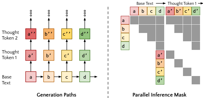 这是最反直觉的一步。通常我们认为生成是串行的(生成完第一个思考,再读下一个字),但那样太慢了。Quiet-STaR 实现了 O(1) 的并行度(相对于 Sequence Length)。