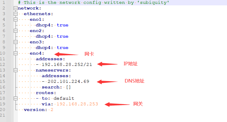 - 请注意,这些更改在重新启动后不会保留。要使更改永久化,您需要编辑网络配置文件,这通常位于/etc/netplan/目录中,文件名可能是01-netcfg.yaml,50-cloud-init.yaml或类似00-installer-config.yaml。编辑该文件,将静态IP地址和相关网络信息添加到配置中,然后应用更改: