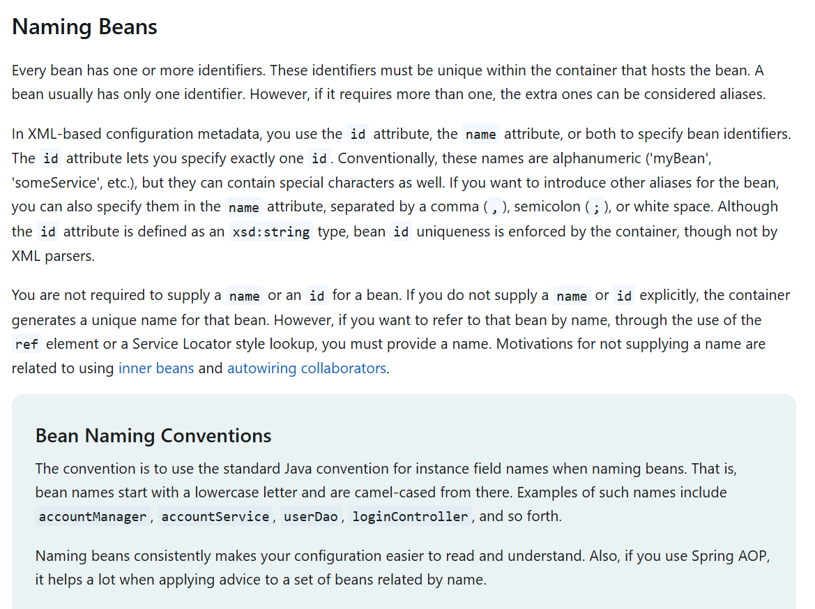 通用命名约定:遵循Java 实例字段的驼峰命名法 ,首字母小写,后续单词首字母大写,如accountManager、userDao、loginController;统一命名可提升配置可读性,也便于 Spring AOP 按名称批量匹配 Bean。