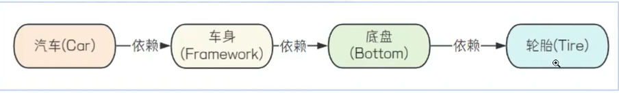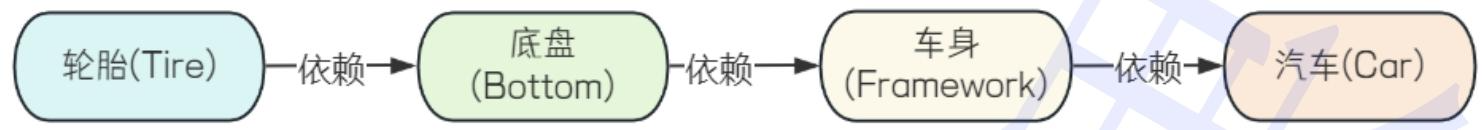 按照传统程序开发的流程,我们想造一辆车,需要先造出车身,而车身需要依赖底盘,底盘又需要依赖轮子。