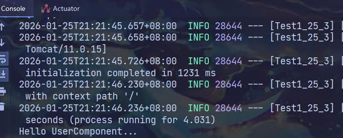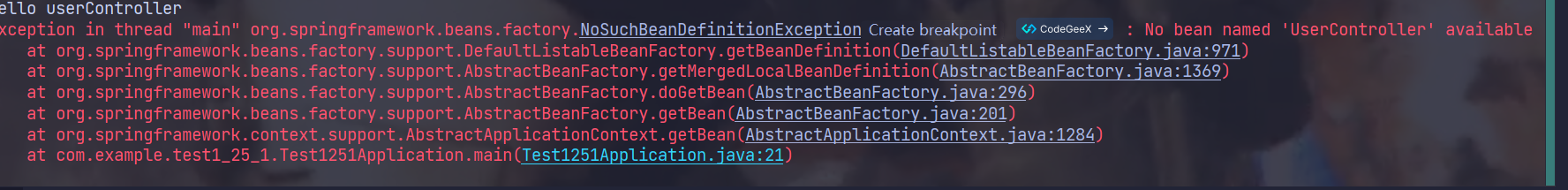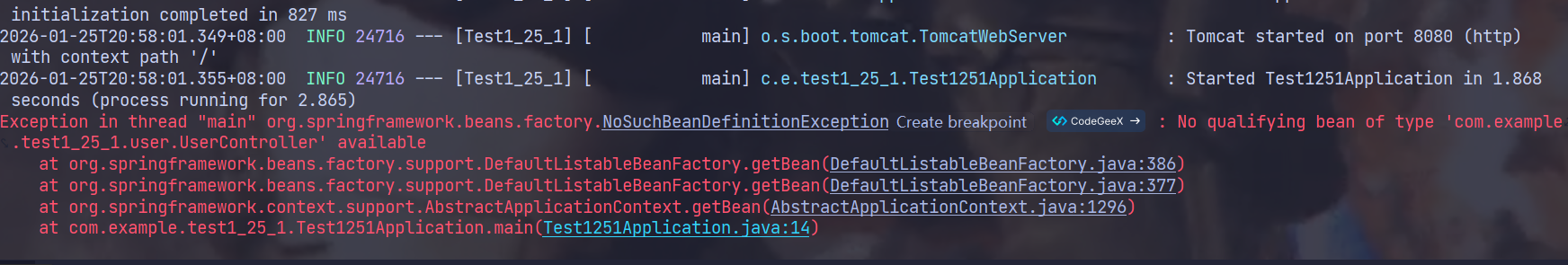 还有一种错误,如果我们忘加了 @Controller 注解,就会出现"No qualifying bean of type 'com.example.test1_25_1.user.UserController' available"的异常,这就是没有将 UserController 实例化作为 Bean 管理起来。
