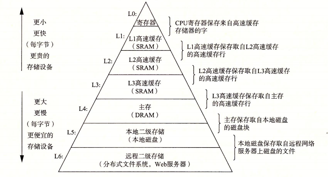 为了解决这个核心矛盾,计算机系统设计了一个类似金字塔 的层次结构。核心思想是:利用造价便宜、容量大的存储设备,作为速度快、造价高、容量小的存储设备的"缓存"。