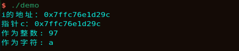 然后再用两个printf分别以整数和字符的格式将这个地址的值打印出来。