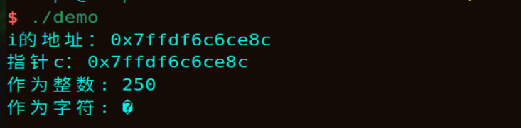 接着我们使用两个printf打印出i的地址和指针变量c的值,后面程序运行时我们可以看到打印出的这两个值其实是相同的,这里的强制类型转换只是让计算机以char来解读该地址存放的值。