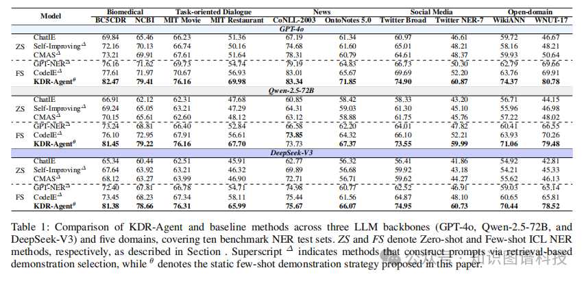 实验结果表明,KDR-Agent在多个LLM骨干模型上显著优于现有的零样本和少样本ICL基线。这一结果验证了框架设计的有效性,特别是在处理未见领域的实体识别任务时。
