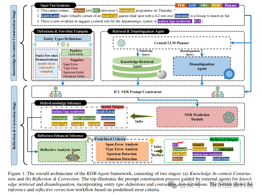 针对上述挑战,本研究提出KDR-Agent------一个专为多领域低资源上下文NER设计的创新性多智能体框架,集成了知识检索(Knowledge Retrieval)、消歧(Disambiguation)和反思分析(Reflective Analysis)三大核心功能。