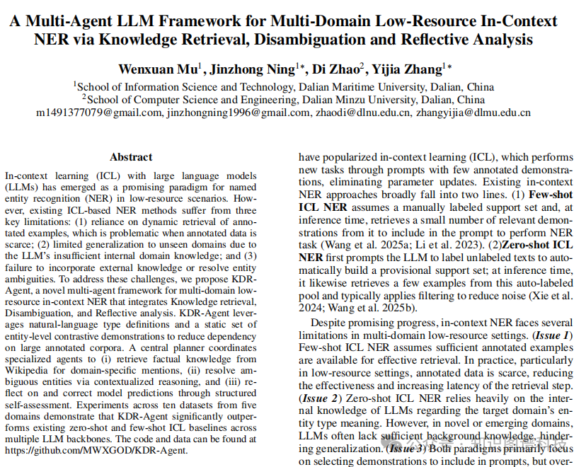 本文提出了KDR-Agent框架,这是一个面向多领域低资源命名实体识别任务的创新性多智能体大语言模型系统。通过整合外部知识检索、语义消歧和结构化反思分析三大核心机制,KDR-Agent有效缓解了传统方法在领域知识覆盖不足和动态示例检索依赖性方面的局限 。
