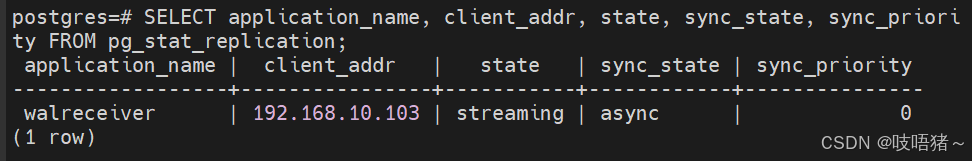 SELECT application_name, client_addr, state, sync_state, sync_priority FROM pg_stat_replication;