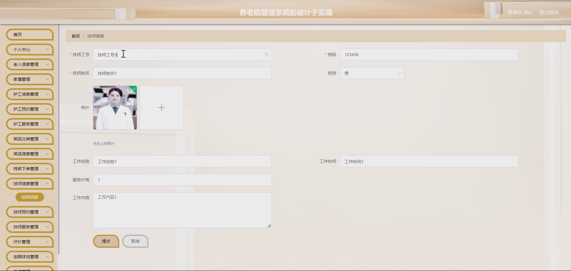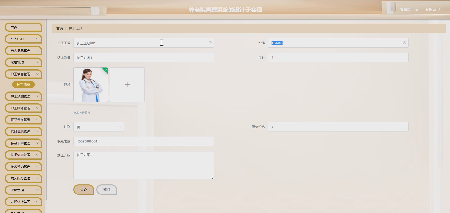 系统项目功能:菜品分类,菜品信息,家属,老人信息,护工信息,护工预约,技师信息,特菜下单,技师预约,评价,定期体检,护工服务,技师服务