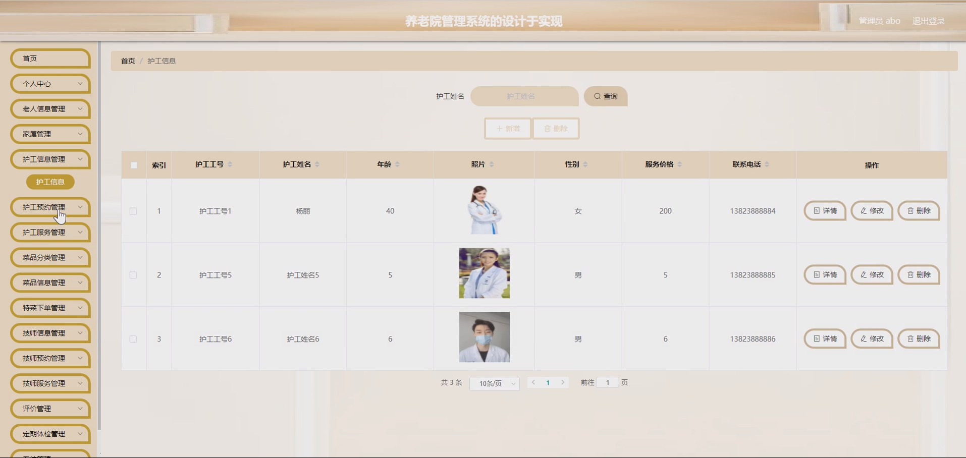 护工信息:管理员维护护工基本信息(姓名、联系方式、资质、负责区域等),支持信息查询、编辑、删除,便于护工管理与调度。