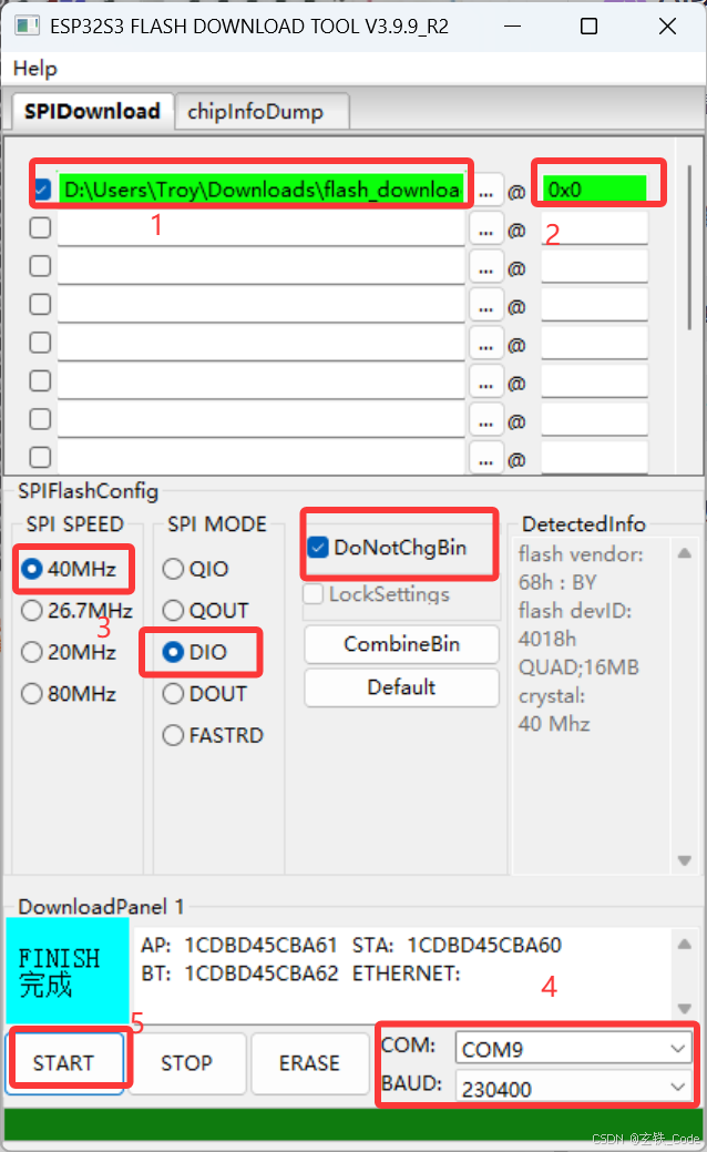 - 点击start开始烧录,会读条,等几分钟会提示成功