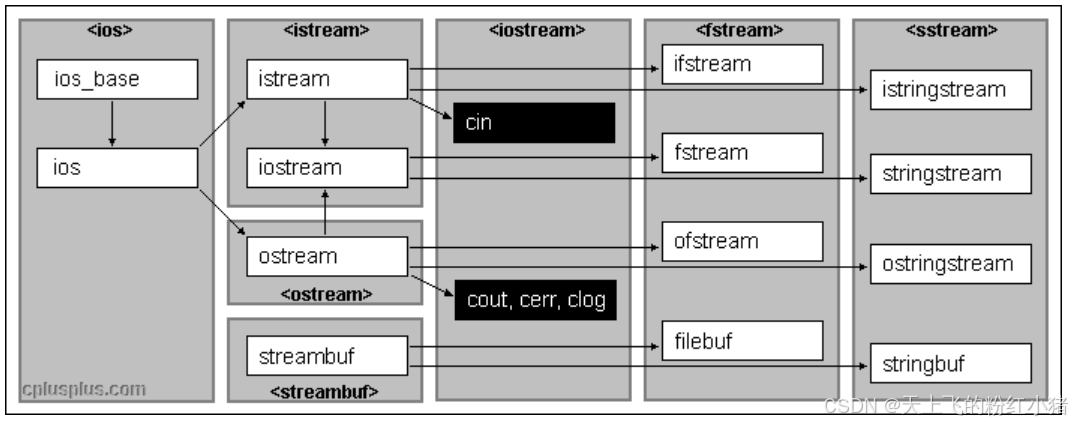 c++实现了很庞大的类库,ios是基类。其他类都是直接或间接派生自ios类。
