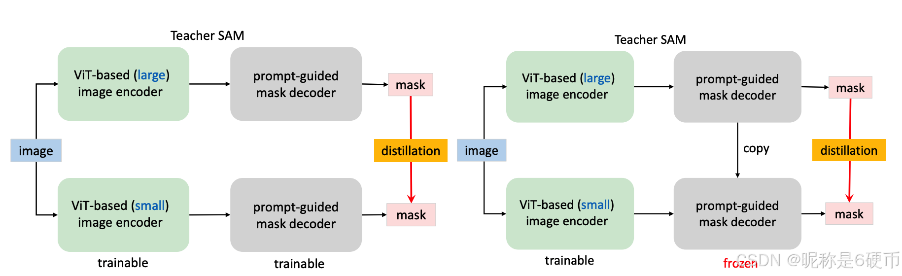 Figure 2: Coupled knowledge distillation of SAM. The left subfigure denotes the fully-coupled distillation, while the right one represents the semi-coupled distillation.