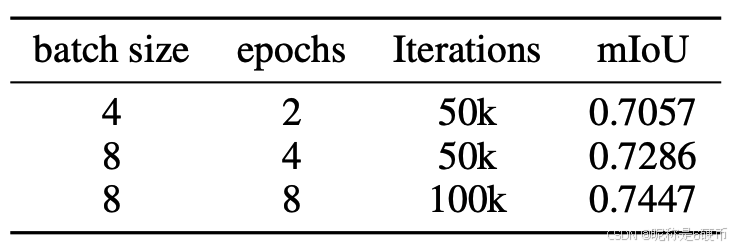 Ablation study. Here, we conduct an ablation study on the influence of the training computation on the performance of SAM. The results in Table 4 show that, under the same number of iterations, increasing the batch size increases the model performance. Moreover, under the batch size, the performance also benefits from more update iterations by increasing the training epochs. Note that all the experiments are conducted on a single GPU. We expect that increasing the number of GPUs for allowing a larger batch size or further increasing the iterations can further improve the performance.