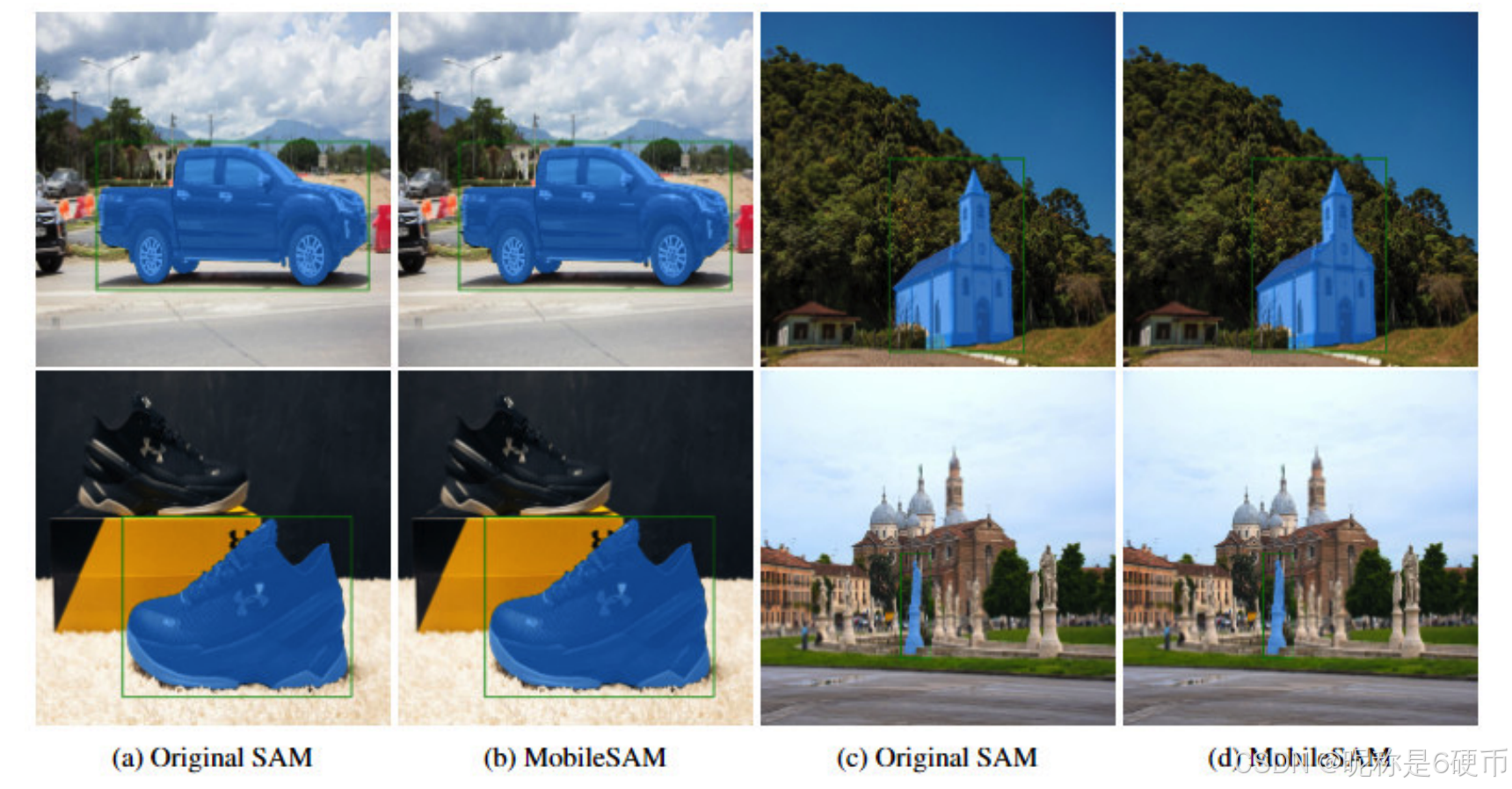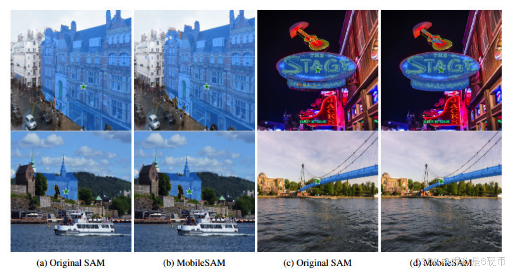 【翻译】对于主要结果,我们报告了使用两种类型提示的预测掩码:点和框。我们没有报告使用文本提示的结果,因为 SAM 的官方 GitHub 项目没有提供用于文本引导掩码解码器的预训练模型。使用点作为提示的结果如图 4 所示,使用框作为提示的结果如图 5 所示。我们观察到 MobileSAM 做出了令人满意的掩码预测,与原始 SAM 相似。