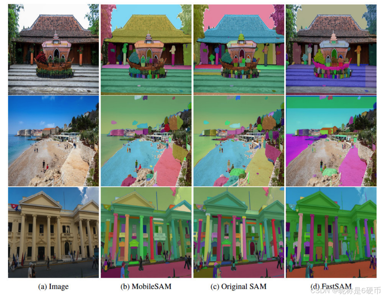 【翻译】"分割所有物体"的结果。"分割所有物体"的结果如图 6 所示。为了完整性,我们还报告了原始 SAM 的结果,它生成了令人满意的物体提议。我们有两个主要观察结果。首先,我们的 MobileSAM 的结果与原始 SAM 的结果惊人地一致。相比之下,FastSAM 的结果通常不太令人满意。例如,FastSAM 经常无法预测某些物体,如第一张图像中的屋顶。此外,掩码提议有时难以解释(参见第一张图像中舞台的掩码和第二张图像中天空的掩码)。其次,FastSAM 经常生成具有非平滑边界的掩码,我们建议读者放大查看图 6 中的细节。例如,第三张图像中的柱子具有非平滑边界,而原始 SAM 和我们的 MobileSAM 没有这个问题。