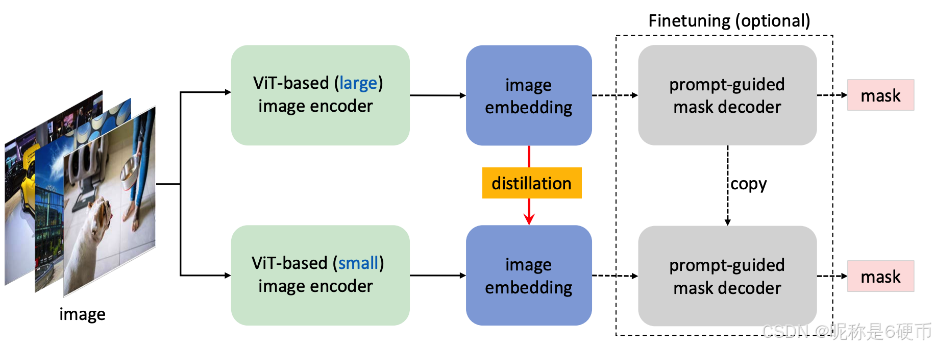 From semi-coupled to decoupled distillation. When performing a KD from the original SAM to that with a smaller image encoder, the difficulty mainly lies in a coupled optimization of the image encoder and combined decoder. Intuitively, the optimization of the image encoder depends on the quality of the image decoder, and vice versa. When the two modules in the SAM are both in a bad state, it is more challenging to train them both to a good state. Inspired by the divide-and-conquer algorithm Zhang et al. [2022c], we propose to divide the KD task into two sub-tasks: image encoder distillation and mask decoder finetuning. Concretely, we first perform the KD on the image encoder by transferring the knowledge from ViT-H to a smaller encoder. Since the mask decoder in the original SAM is already lightweight, we plan to keep its architecture. This brings a benefit of a readily used combined decoder for finetuning instead of training it from scratch. To alleviate the optimization issue of coupled distillation, a straightforward way is to optimize the image encoder with a copied and frozen mask decoder (see Figure 2 right). The freezing operation can help prevent the quality of the mask decoder from being deteriorated by a poor image encoder. We call this distillation semi-coupled because the optimization of the image encoder is still not fully decoupled from the mask decoder. Empirically, we find that this optimization is still challenging because the choice of a prompt is random, which makes the mask decoder variable and thus increases the optimization difficulty. Therefore, we propose to distill the small image encoder directly from the ViT-H in the original SAM without resorting to the combined decoder, which is termed decoupled distillation (see Figure 3). Another advantage of performing distillation on the image embedding is that we can adopt a simple MSE loss instead of using a combination of focal loss Lin et al. [2017] and dice loss Milletari et al. [2016] for making the mask prediction as in Kirillov et al. [2023].