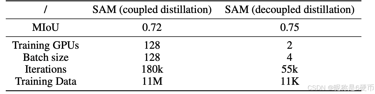 【翻译】表 2:以 ViT-B 作为图像编码器的 SAM 的耦合蒸馏和解耦蒸馏的比较。解耦蒸馏性能更好,所需的计算资源不到耦合蒸馏的 1 % 1\% 1%。