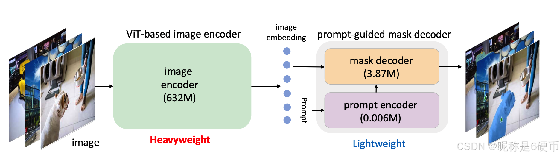 【解析】无标签分割(label-free segmentation)是 SAM 的创新,传统的分割模型需要预定义类别(如"猫"、"狗"),只能分割训练时见过的类别,而 SAM 不需要知道物体是什么类别,只需要根据提示就能将其从背景中分割出来。SAM实际部署时面临挑战,图像编码器基于 ViT-H,有超过 600M 参数,需要大量计算资源。一旦图像编码完成,后续的交互式分割(用户点击不同位置生成不同掩码)都很快,因为只需要运行轻量的解码器。因此,本文的核心目标就是用轻量级编码器替换 ViT-H,同时保持分割性能。