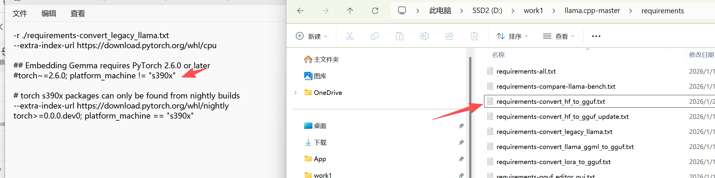 llamacpp自带的依赖文件里面会强制指定torch的版本,这个torch版本回合电脑本地的环境产生冲突,我们可以打开requirements这个文件夹,然后打开requirements-convert_hf_to_gguf,注释掉里面的torch依赖,自己手动在虚拟环境中安装pytorch依赖