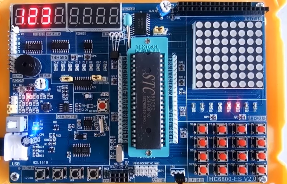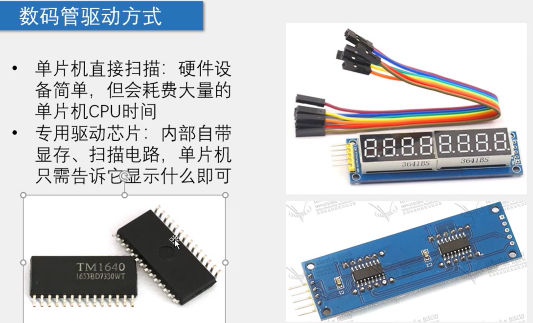 TM1640:专用驱动芯片扫描,单片机通过特定协议告诉tm1640显示什么,他自己会不断地扫描数码管 ,它只需要两根线可以控制16个数码管显示任意数字,它就不会出现不显示,闪烁的问题