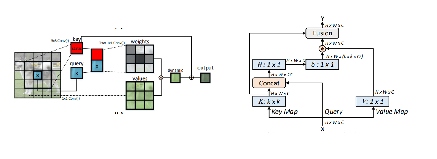 Contexttual Transformer (CoT)通过3✖3卷积对输入键进行上下文编码,然后将其与查询拼接,并通过两个连续的1✖1卷积学习动态多头注意力矩阵,然后将矩阵与输入值相乘,获得动态上下文表征。这种设计充分挖掘了输入键值之间的上下文信息,用以指导动态注意力矩阵的学习,从而增强视觉表征能力。