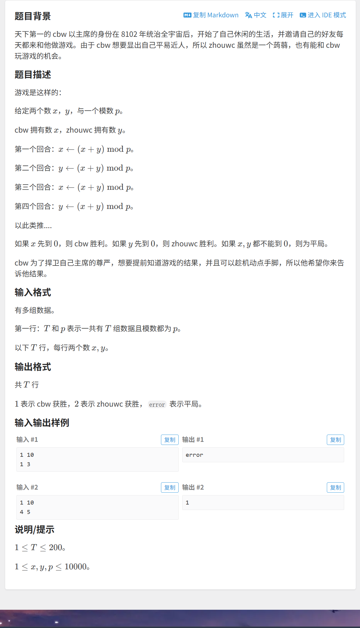 例如双方一开始的数字分别为x 和 y ,但兜兜转转又回到了x 和 y。如果有一个能到达0,那么在这个循环中早就跳出了,不会回到起点。因此我们定义一个set<pair<int,int>>,记录每次两个人的数的情况,如果发现在set中早就记录过了,那么说明循环了一次,谁也不会赢