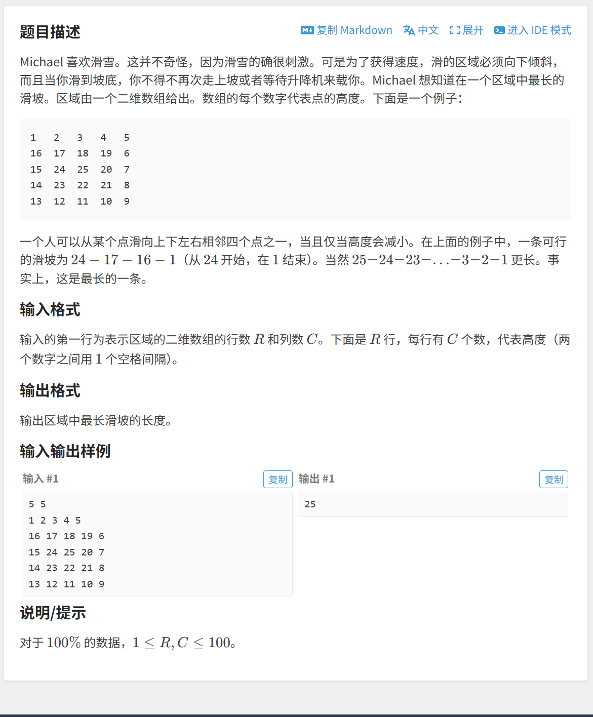 这题的关键点在于,我们可以选择任意一个格子滑雪,找到最长的路径、