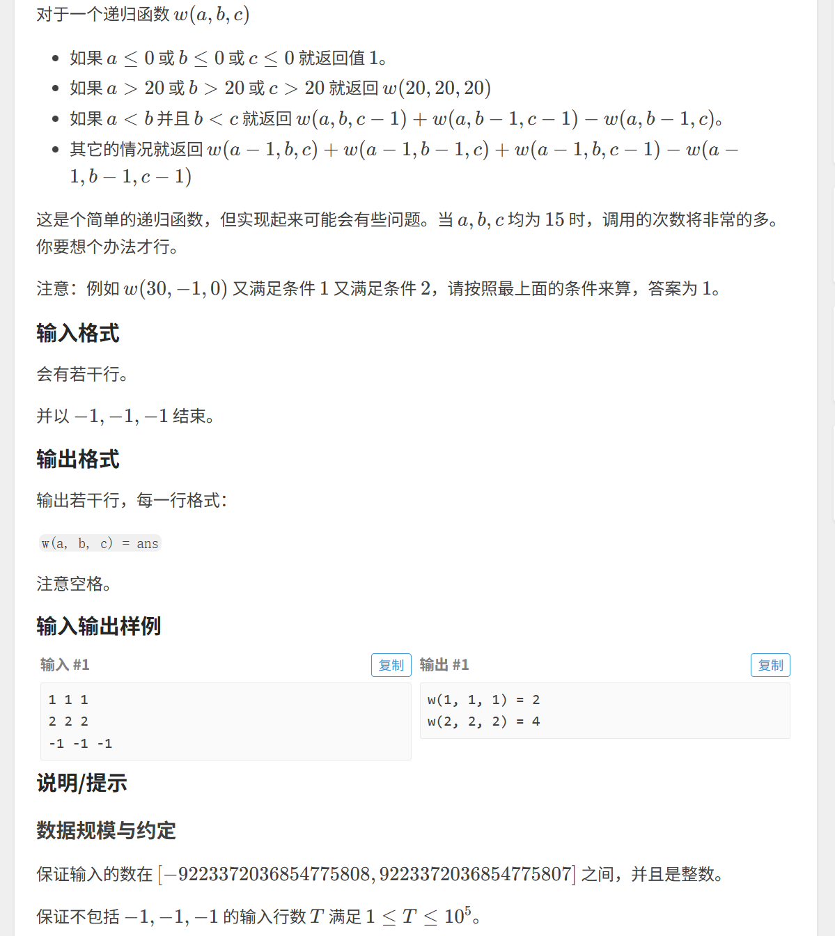 printf("w(%lld, %lld, %lld) = %lld\n", a, b, c, dfs(a, b, c));