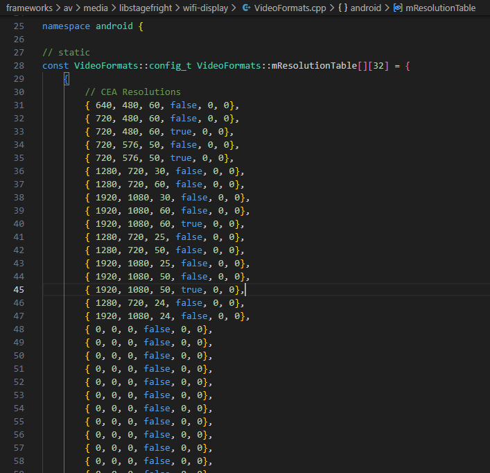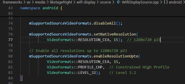 android11发送端设置的最大支持视频格式是1280720 p23格式,如果想改成支持1920 1080 p23,只需要把下图中的15改成16即可。