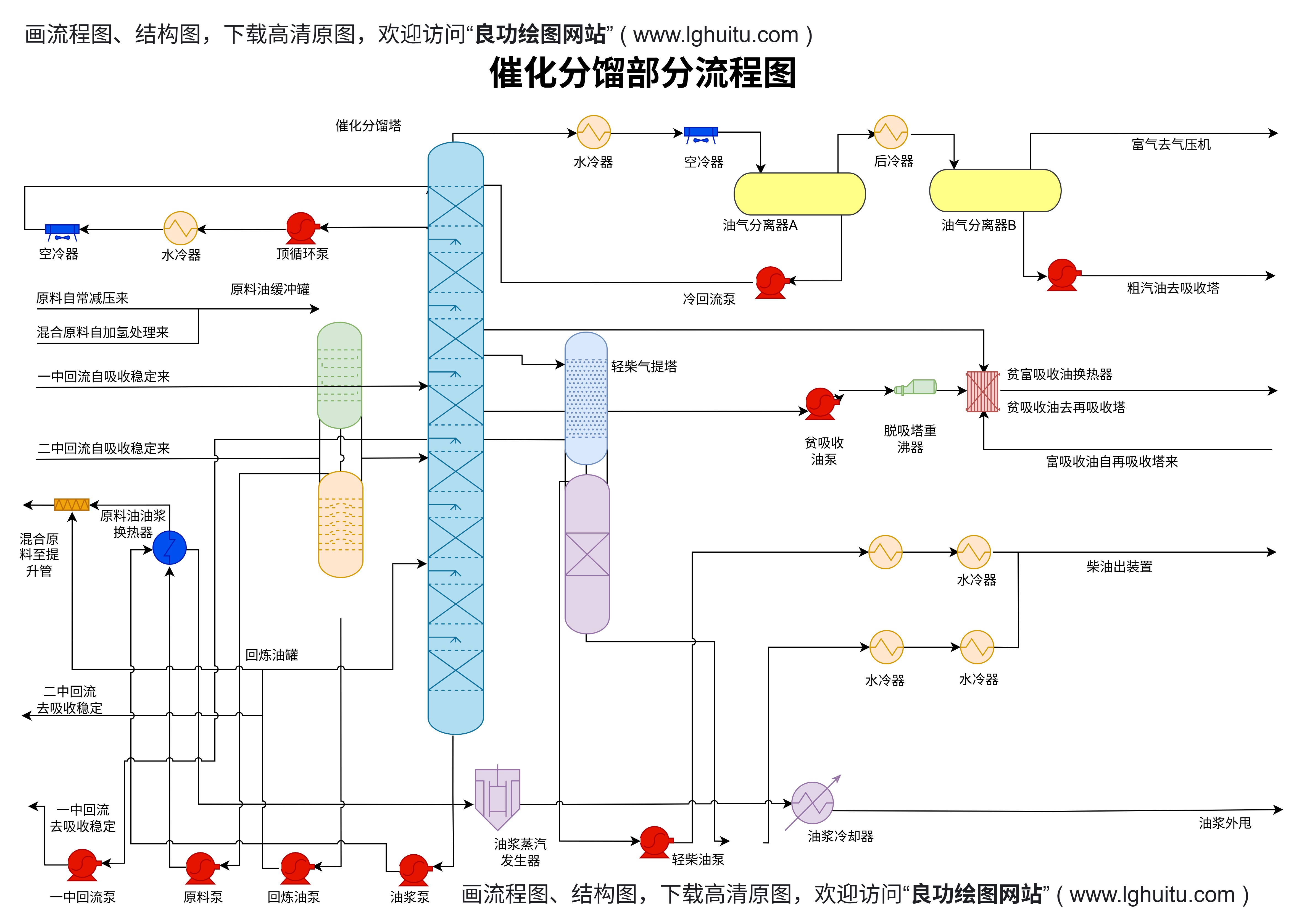 - 核心设备:催化分馏塔(主设备,放置于画布中央)、原料油缓冲罐、冷回流泵、顶循环泵、轻柴气提塔、贫富吸收油换热器,围绕分馏塔布局;