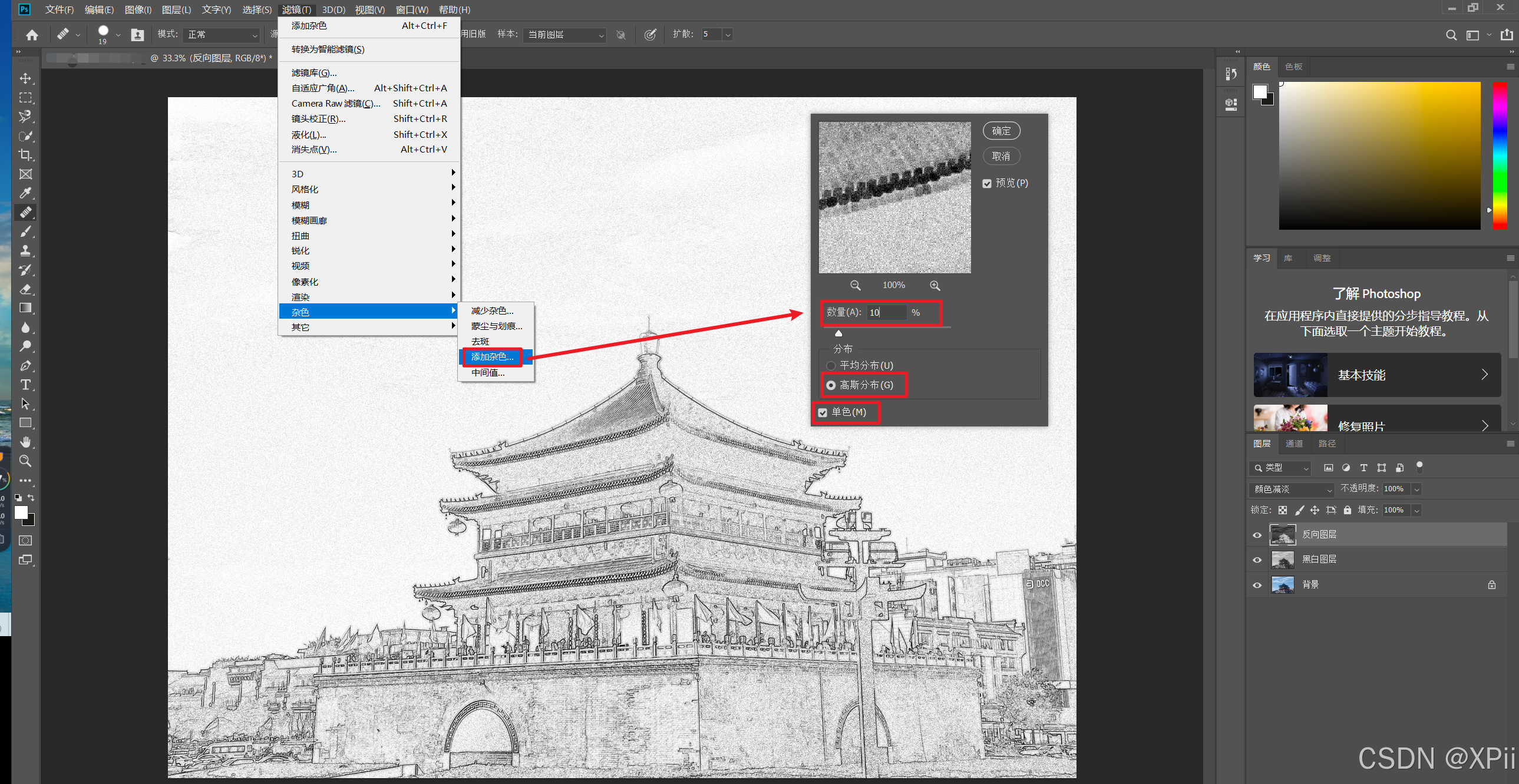 滤镜->杂色->添加杂色"命令,在弹出的对话框中设置数量为10%,勾选高斯分布和单色选项;