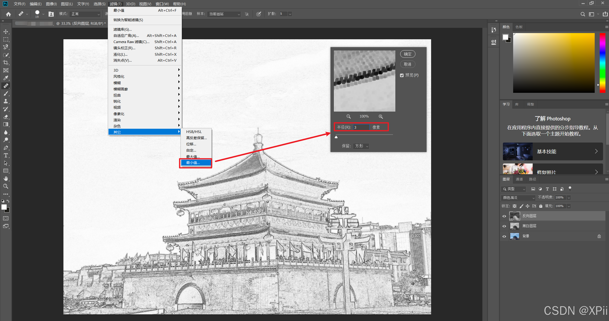 滤镜->其它->最小值"命令,在弹出的对话框中设置半径为3像素;