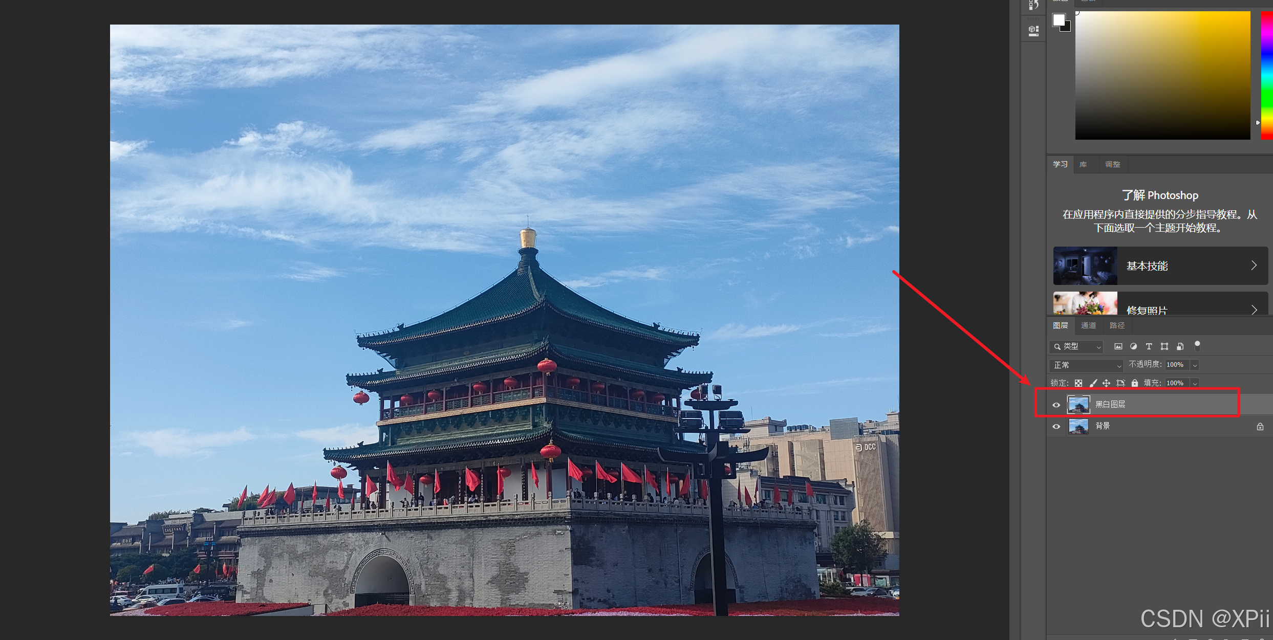 - 去色处理(2):将复制的背景图层重命名为"黑白图层";