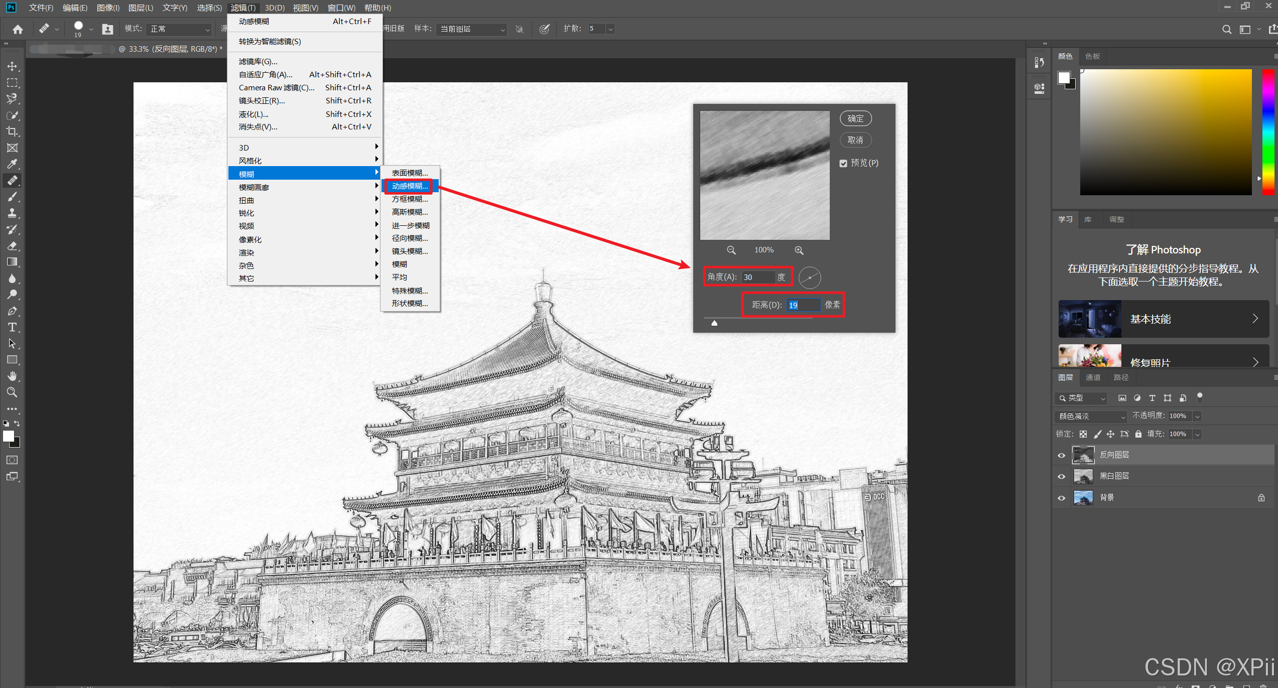 滤镜->模糊->动感模糊"命令,在弹出的对话框中设置角度为30度,距离为19像素,此时会将颗粒处理成铅笔的笔触,看起来更加真实;